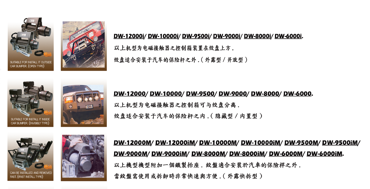 汽車絞盤主要用于越野汽車、農(nóng)用汽車、ATV運動車、艇游、以及其它特別車輛,是車輛、船只自我保護及牽引的裝置??稍谘┑?、沼澤、沙漠、海灘、泥濘山路等惡劣環(huán)境中進行車輛自救,并可能在其它條件下,進行清障、拖拉物品、安裝設(shè)施等作業(yè),是軍警、石油、水文、環(huán)保、林業(yè)、交通、公安、邊防、消防及其它野外運動不可缺少的安全裝置。